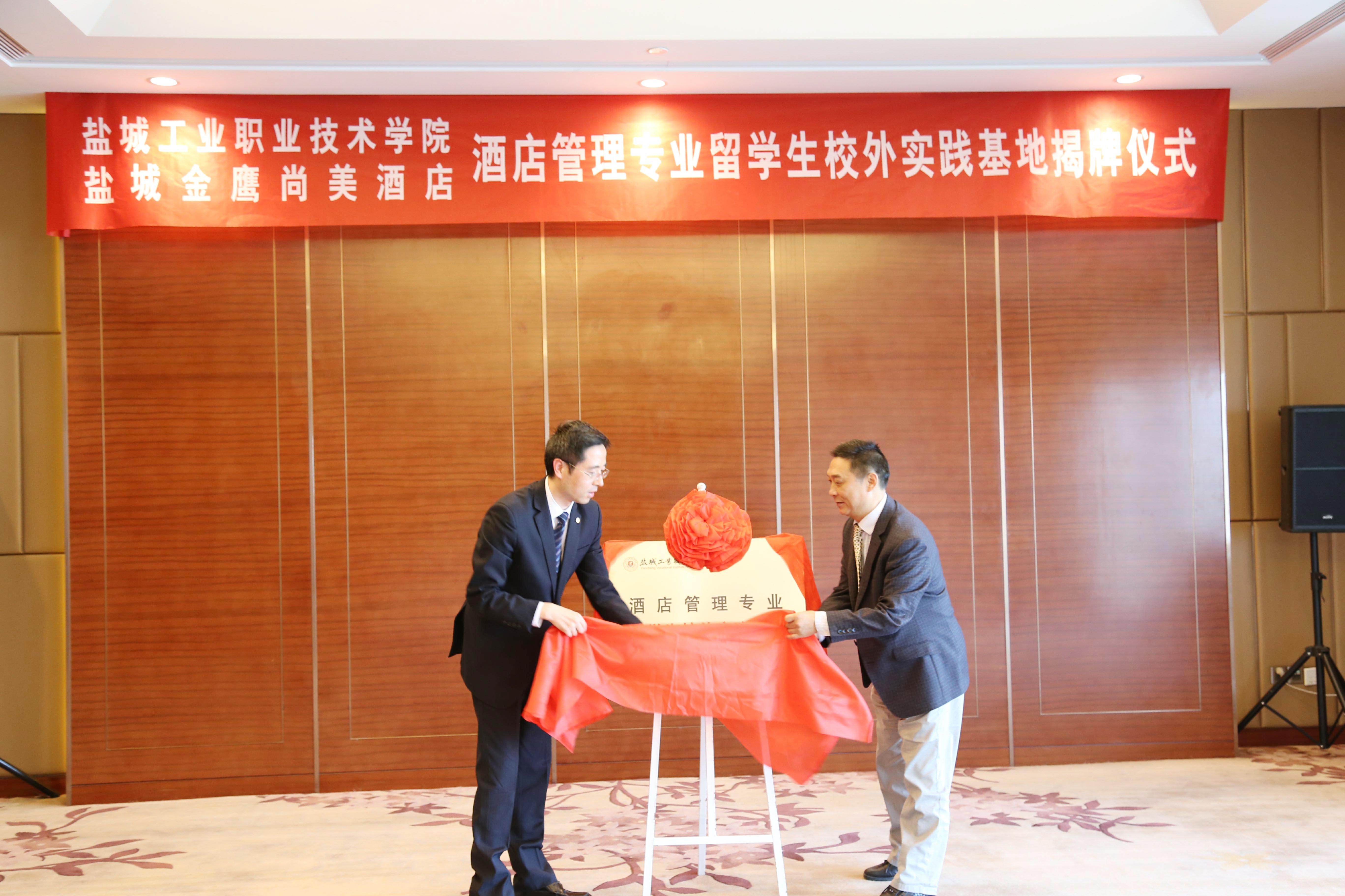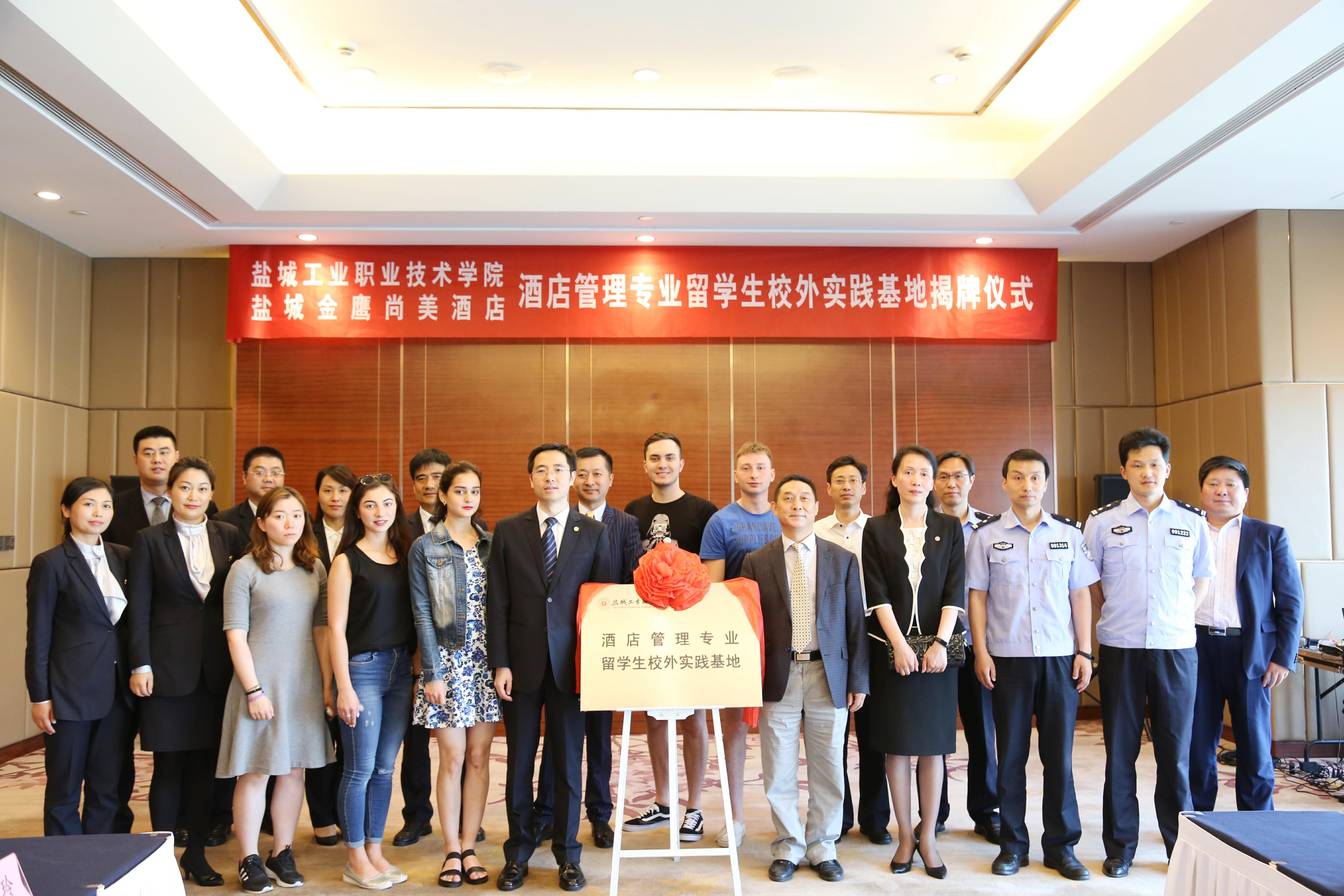 5月17日,我校酒店管理专业留学生校外实践基地揭牌仪式在盐城金鹰尚美酒店国宾第三会议室成功举行。校长李仁和,副校长孙卫芳,国际合作处处长徐宏桂,经贸管理学院院长李桂付、副院长周荣虎、酒店管理专业负责人陈传亚,南京金鹰酒店管理有限公司总经理顾庆春,盐城金鹰尚美酒店总经理谷雨、酒店各部门总监,盐城市公安局出入境管理支队副队长薛健、科长张添,盐城市公安局城南分局新都派出所副所长牛万富等出席了仪式。揭牌仪式由盐城金鹰尚美酒店人力资源总监郭春玲主持。