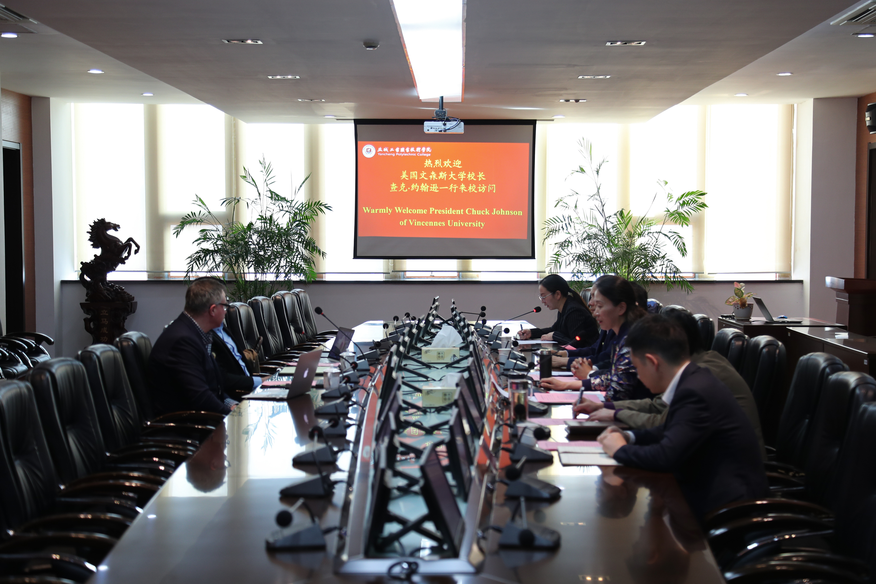10月31日,美国文森斯大学校长查克·约翰逊博士一行访问我校。我校校长瞿才新、副校长孙卫芳热情接待了来访客人并进行了座谈交流。国际合作处、校长办公室、人事处、教务处等部门负责同志参加会谈。