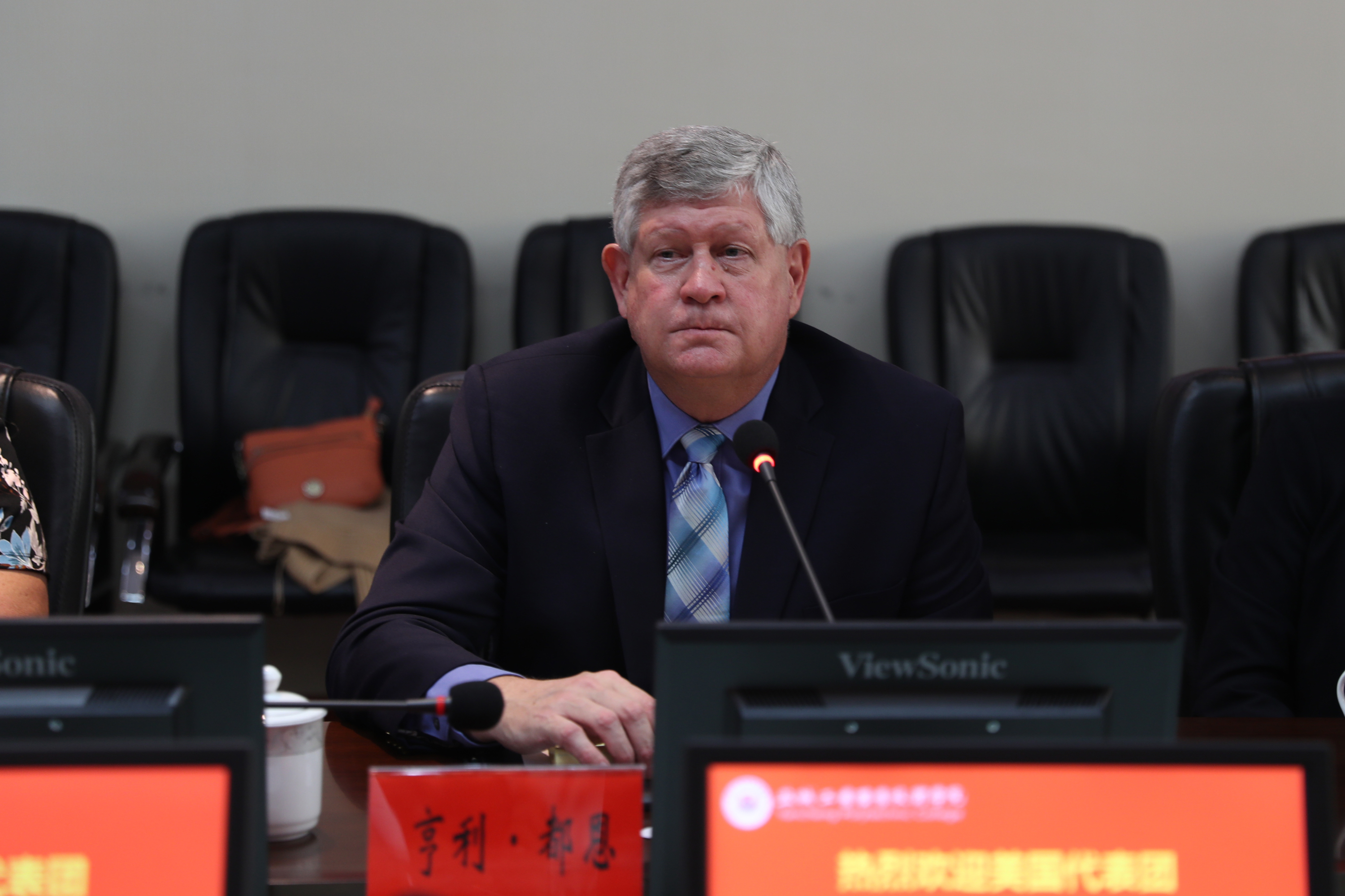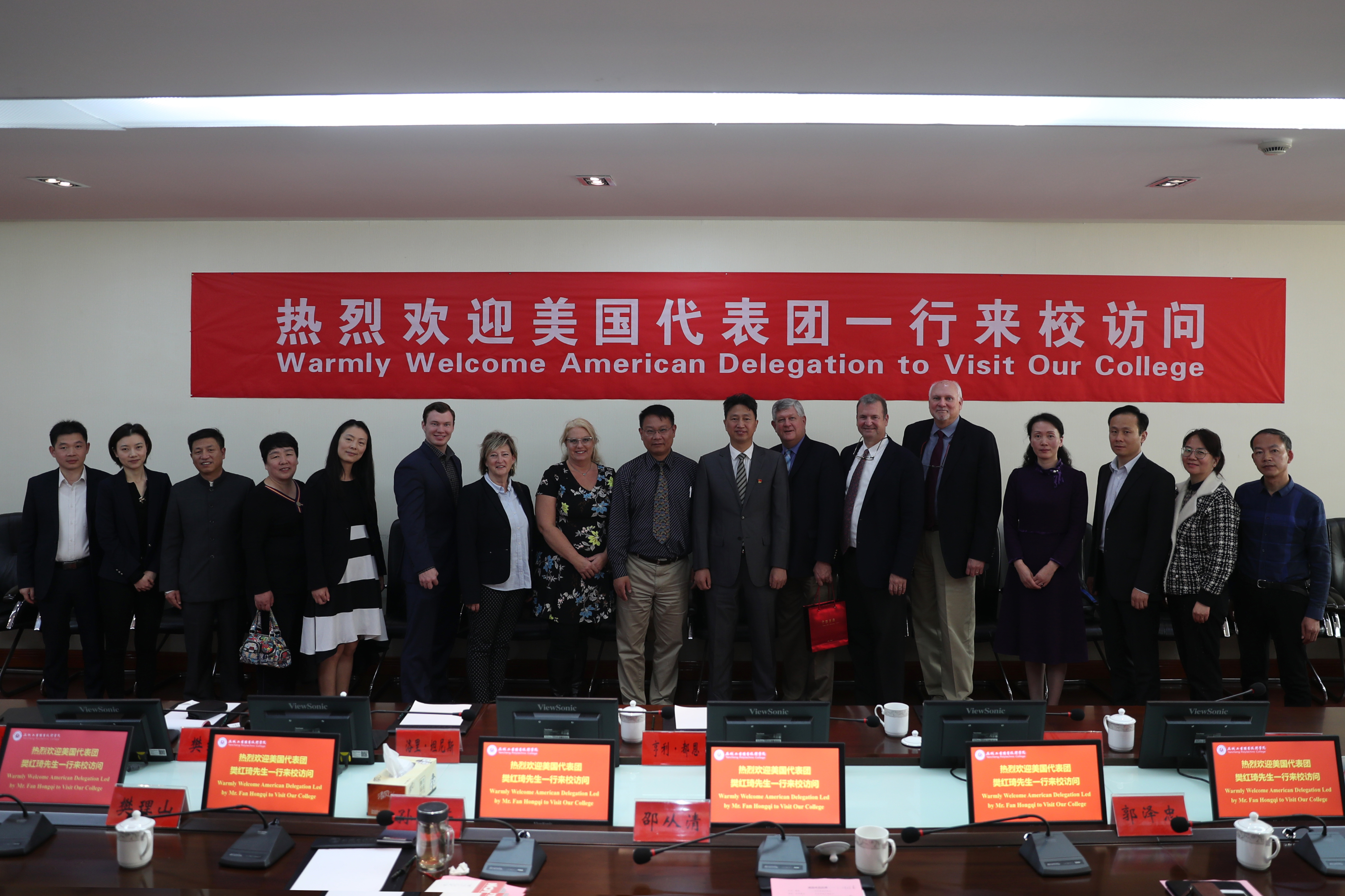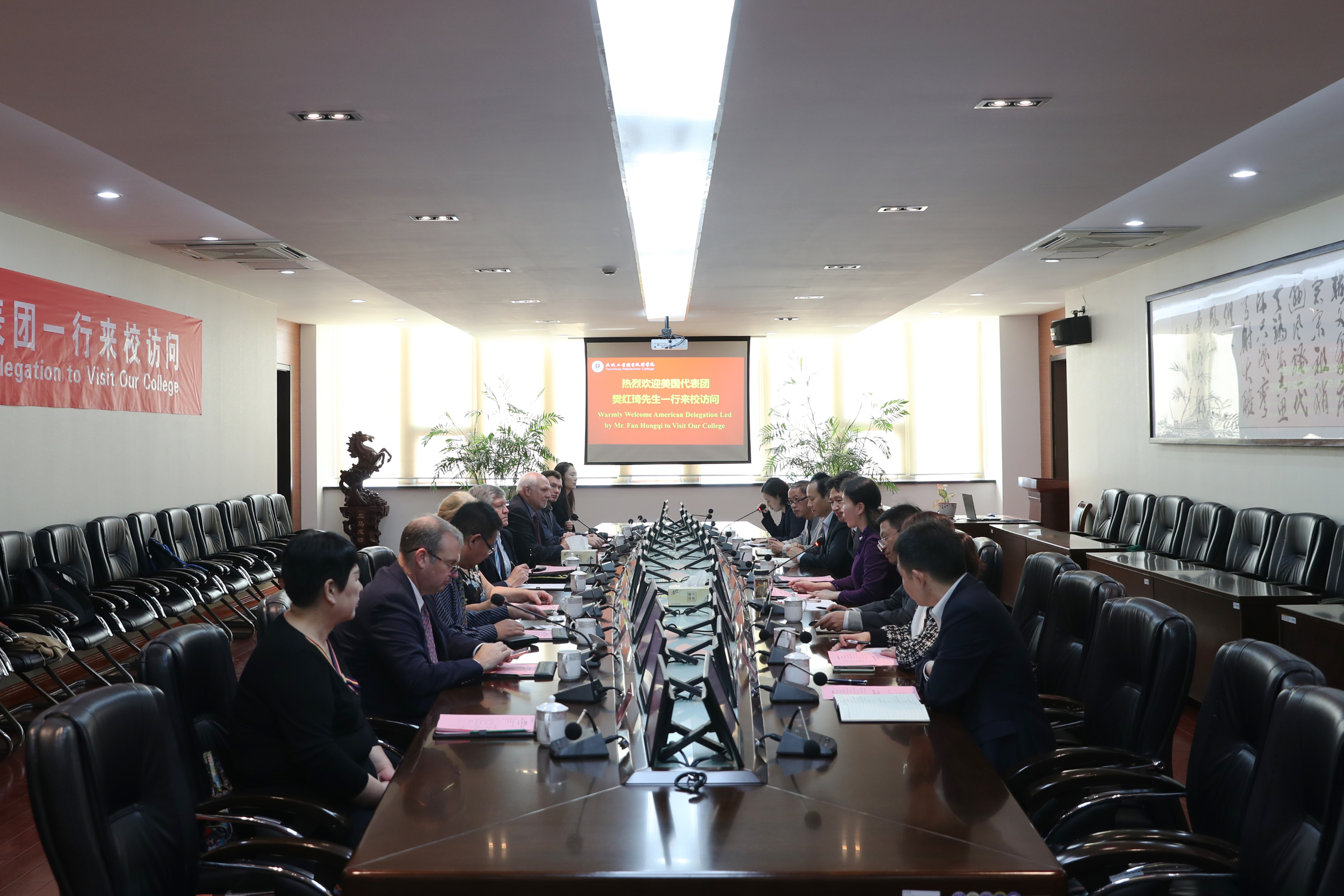 邵从清代表学校对美国教育代表团一行表示热烈欢迎,并向来宾介绍了盐城和学校的发展建设情况,希望双方能够主动对接需求,切实加强交流合作,为中美两国教育交流贡献智慧和力量。代表团主要成员芝加哥高中校长亨利·都恩,威廉斯顿三一学校校长特里•休伊曾加,中美文化教育交流中心总裁樊红琦,LM房产公司总裁泰德·拉盖斯蒂分别致辞,他们对我校的热情接待表示感谢,对学校的教学设施、管理水平表示赞赏,愿意与我校开展进一步合作。