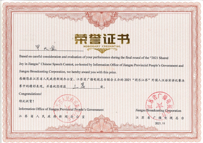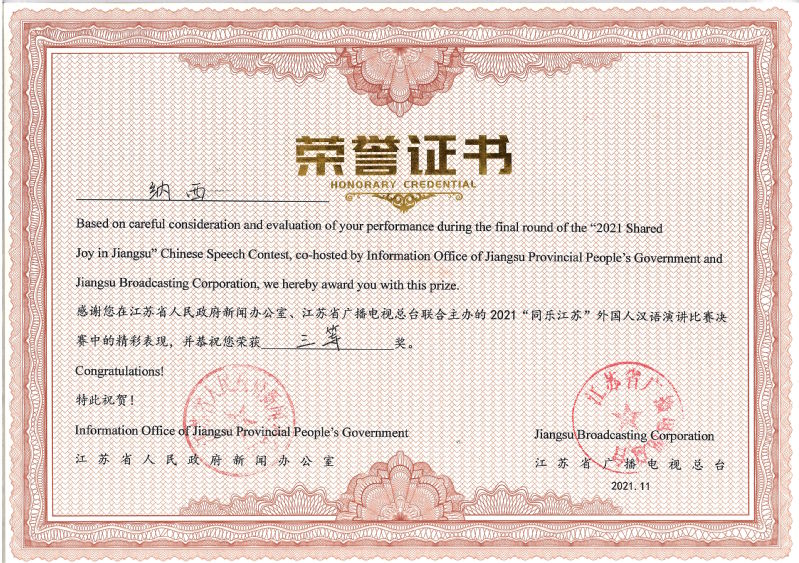 近日,由江苏省人民政府新闻办公室、江苏省广播电视总台联合主办的“2021‘同乐江苏’外国人汉语演讲比赛”落下帷幕。比赛以云录制的方式进行,我校遴选并推荐10名留学生参加海选,8名同学入围复赛。其中,塔吉克斯坦籍留学生纳西和越南籍留学生甲大金两人表现出色,入围总决赛并同时获得三等奖的优异成绩,全省仅有3名高职院校留学生入围总决赛。