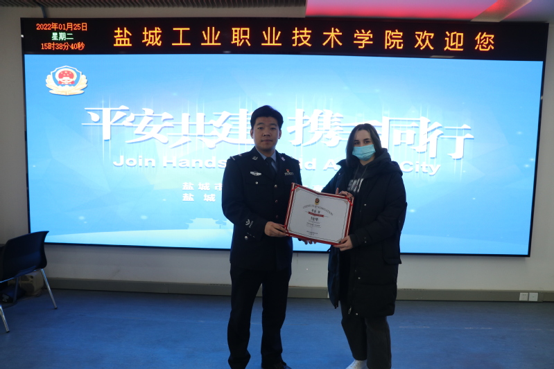 活动最后,民警为4位成绩优异的留学生代表颁发聘书,邀请他们作为“盐南平安志愿者”,并祝愿他们在中国可以度过一个喜庆、文明、平安的春节。