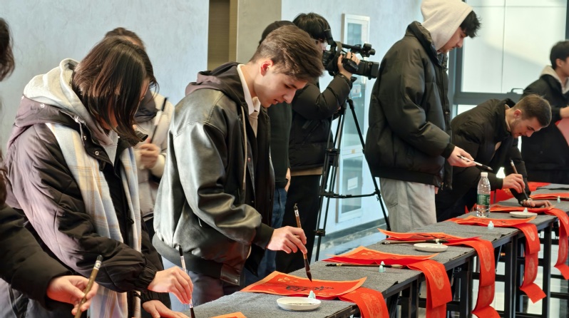 书法体验环节中,专业老师现场指导,留学生初次握笔临摹“福”字与新春吉语,在笔墨间感受中国书法魅力,写下对新年、青春与友谊的美好祝愿。